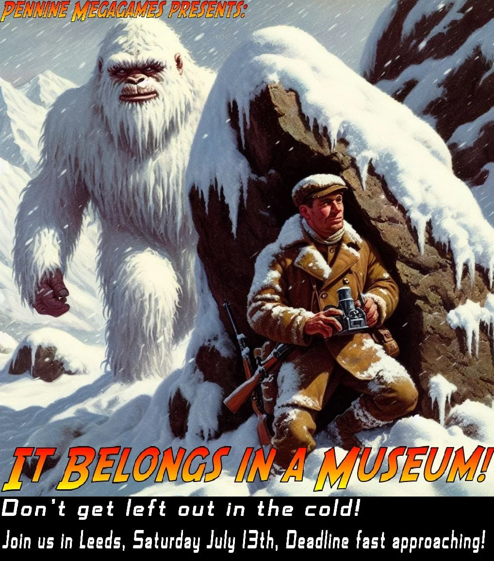Pennine Megagames invites you to the second UK run of It Belongs in a Museum! Join us at Leeds Gateway Church on Saturday July 13th for more excitement and adventure than you can crack a bullwhip at.