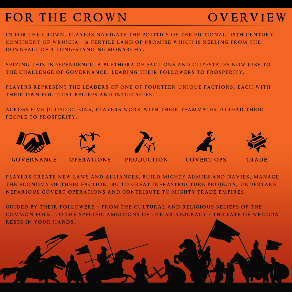 For The Crown (Sydney, NSW, Australia) Saturday 5 October 2019 10:00 17:00 Rex Centre 58A Macleay Street Elizabeth Bay, NSW, 2011 Australia (map) Google Calendar ICS Organiser: Melbourne MegagamesDesigner: Patrick Doyle Learn more