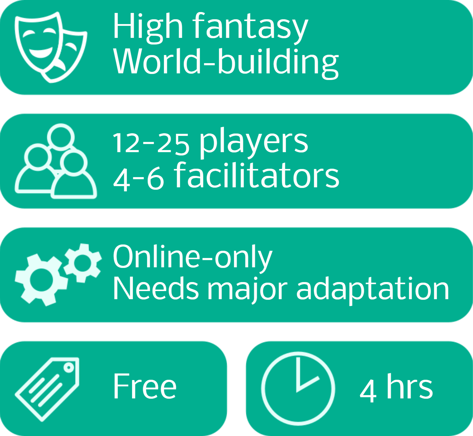 Listed here are a few well-known games that the designers have made available in a form which is ready to be printed and run, with no or minimal adjustments. We’ve also added some notes about them to help you decide which one will be right for your group.